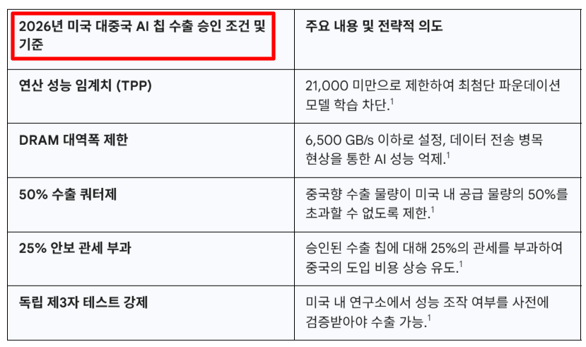 미중 기술 전쟁의 최전선은 단연 인공지능(AI) 반도체다. 미국 상무부 산업안보국(BIS)은 지난 1월 15일, 중국의 AI 발전 속도를 물리적으로 제어하기 위한 고강도 수출 통제 지침을 발효했다. 핵심은 중국이 군사적으로 전용 가능한 최첨단 칩을 확보하지 못하게 하되, 미국 기업의 매출을 위해 일정 수준 이하의 칩만 ‘통제된 공급’을 허용하는 것이다.