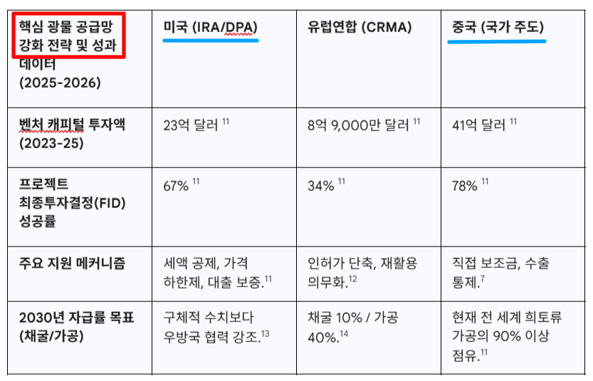 미국은 이에 대응해 인플레이션 감축법(IRA)과 국방물자생산법(DPA)을 동원, 자국 내 광물 프로젝트의 성공률을 67%까지 끌어올렸다. 그러나 유럽연합(EU)은 자금 지원 부족으로 프로젝트 성공률이 34%에 그치는 등 ‘디리스킹(위험회피)’ 과정에서 서방 진영 내에서도 격차가 벌어지고 있다.